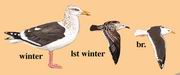 描述:体大(61厘米)、背部深灰色的鸥。腿粉红色,嘴黄色上具红点。似银鸥的复合体但上体灰色更深,腿更显粉红。白色月牙形肩带较宽。冬季成鸟头后及颈部具褐色纵纹。第一冬鸟比多数银鸥色深,尾完全深褐。