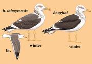 描述:体大(60厘米)的暗灰色鸥。腿鲜黄色,上体灰至深灰(taimyrensis)或深灰(heuglini),比其他银鸥复合体中其他种及海鸥色深。冬季成鸟头具少量至中量的纵纹,嘴上无或仅具一丝黑色带。颈背纵纹最多。三级飞羽白色月牙形斑宽,但肩部月牙形斑或细或无。初级飞羽的两枚外侧羽具微小的白色羽端,至第六、七枚羽逐渐增大。飞行时初级飞羽外侧翼镜中等大小,第九枚初级飞羽具一小翼镜。初级飞羽外侧色深,与白色翼下覆羽及次级飞羽羽尖成对照。眼周裸皮红色。