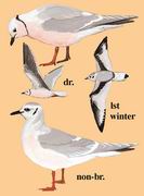 描述:体小(31厘米)的独特鸥种。特征为嘴黑,腿红,颈环黑,上体浅灰,下体及楔形尾玫瑰色。越冬成鸟无颈环,玫瑰色或少或无。与红嘴鸥的区别在翼无黑色,眼斑色暗并具楔形尾。第二年鸟具成鸟体羽。第一冬鸟似冬季成鸟,但飞行时上体具"W"形斑纹,尾具部分横带。与第一冬小鸥区别在无深色顶冠并具楔形尾。