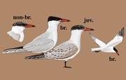 描述:体型硕大(49厘米)的燕鸥。特征为具形大的红嘴。顶冠夏季黑色,冬季白并具纵纹。初级飞羽腹面黑色。亚成鸟上体具褐色横斑。第一冬鸟似成鸟,但两翼具褐色杂点,顶冠深黑。