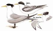 描述:体大(45厘米)的具羽冠的燕鸥。夏季头顶及冠羽黑色,由具白色杂斑过渡为冬羽的头顶白色、冠羽具灰色杂斑。上体灰,下体白。幼鸟较成鸟灰色深沉,上体具褐色及白色杂斑;尾灰色。嘴上色彩最有别于其他凤头燕鸥。