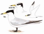 描述:中等体型(38厘米)的凤头燕鸥。特征为黄色的嘴尖端黑色。冬羽额白,顶冠黑色而具白色顶纹,使枕部成"U"形黑色斑块。与大、小凤头燕鸥的区别在黄色的嘴其端部三分之一为黑色。亚成鸟似小凤头燕鸥的亚成鸟,但褐色较重,翼内侧色浅并具两道深色横纹,背及尾近白而具褐色杂斑。