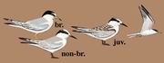 描述:体小(24厘米)的浅色燕鸥。尾开叉浅。夏季:头顶、颈背及过眼线黑色,额白。冬季:头顶及颈背黑色减小至月牙形,翼前缘黑色后缘白色。幼鸟:似非繁殖期成鸟但头顶及上背具褐色杂斑,尾白而尾端褐,嘴暗淡。