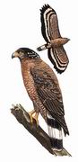 描述:中等体型(50厘米)的深色雕雕。两翼甚圆且宽而尾短。成鸟:上体深褐色/灰色,下体褐色,腹部、两胁及臀具白色点斑。尾部黑色横斑间以灰白色的宽横斑,黑白两色的冠羽短宽而蓬松,眼及嘴间黄色的裸露部分是为本种特征。飞行时的特征为尾部宽阔的白色横斑及白色的翼后缘。亚成鸟似成鸟但褐色较浓,体羽多白色。