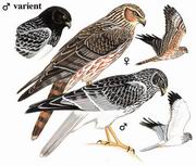 描述:中等体型(50厘米)的深色鹞。雄鸟似鹊鹞雄鸟,但喉及胸黑并满布白色纵纹。雌鸟尾上覆羽褐色或有时浅色,有别于除白头鹞外的所有种类雌鹞。体羽深褐,头顶、颈背、喉及前翼缘皮黄色;头顶及颈背具深褐色纵纹;尾具横斑;从下边看初级飞羽基部的近白色斑块上具深色粗斑。一些个体头部全皮黄色,胸具皮黄色块斑。亚成鸟似雌鸟但色深,仅头顶及颈背为皮黄色。