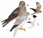 描述:雄鸟:体型略大(50厘米)的灰色或褐色鹞。具显眼的白色腰部及黑色翼尖。体型比乌灰鹞大,比草原鹞也大且色彩较深。缺少乌灰鹞次级飞羽上的黑色横斑,黑色翼尖比草原鹞长。雌鸟褐色,与乌灰鹞的区别在领环色浅,头部色彩平淡且翼下覆羽无赤褐色横斑。与草原鹞的区别在深色的后翼缘延伸至翼尖,次级飞羽色浅,上胸具纵纹。幼鸟与草原鹞及乌灰鹞幼鸟的区别在两翼较短而宽,翼尖较圆钝。