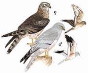 描述:雄鸟:中等体型(46厘米)的灰色鹞。翼尖黑色,体型比白尾鹞略显细小而轻盈。与白尾鹞及草原鹞的区别为次级飞羽上有一条、下有两条黑色条带。腰部色浅,但不如白尾鹞清楚。雌鸟褐色,与白尾鹞及草原鹞区别于无浅色领环,飞行时翼下次级飞羽两道暗色横纹间隔较宽。幼鸟比白尾鹞幼鸟两翼显长而细,与草原鹞的区别在飞行时翼尖全深色。