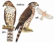 描述:体大(42厘米)的强健鹰类。具短羽冠。成年雄鸟:上体灰褐,两翼及尾具横斑,下体棕色,胸部具白色纵纹,腹部及大腿白色具近黑色粗横斑,颈白,有近黑色纵纹至喉,具两道黑色髭纹。亚成鸟及雌鸟:似成年雄鸟但下体纵纹及横斑均为褐色,上体褐色较淡。飞行时两翼显得比其他的同属鹰类较为短圆。