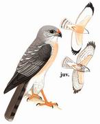 描述:中等体型(33厘米)的鹰类。 下体色甚浅。成鸟:上体淡蓝灰,背部羽尖略具白色,外侧尾羽具不明显黑色横斑;下体白,胸及两胁略沾粉色,两胁具浅灰色横纹,腿上也略具横纹。成鸟翼下特征为除初级飞羽羽端黑色外,几乎全白。亚成鸟:上体褐色,尾具深色横斑,下体白,喉具纵纹,胸部及腿上具褐色横斑。
