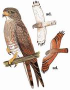 描述:中等体型(40厘米)的鵟鹰。两翼及尾栗色,下体色浅,头及颈背褐灰,上体褐色,具黑色杂斑及纵纹。颏、喉及胸灰色,腹部及臀白色。两翼长而尖,尾细长,平形。