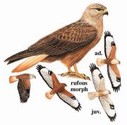 描述:体大(64厘米)的棕色鵟。翼及尾长。头和胸色浅,靠近腹部变成深色,但有几种色型,从米黄色至棕色至极深色。近黑色型的飞羽及尾羽具深色横斑。尾上一般呈浅锈色至橘黄色而无横斑。飞行似普通鵟,棕色型翼下翼角处具黑色大块斑。滑翔时两翼弯折(c.f. 普通鵟两翼平伸),随气流翱翔时高举成一角度。幼鸟外侧尾羽及翼下暗色后缘均具横纹。与毛脚鵟的区别在尾上端无黑色带斑。