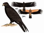 描述:体大(70厘米)的褐黑色雕雕。蜡膜及脚黄色。歇息时两翼长于尾。飞行时与其他深色雕的区别在尾长而宽,两翼长且由狭窄的基部逐渐变宽,具显著"手指"。初级飞羽基部具明显的浅色斑块,尾及尾上覆羽具浅灰色横纹。亚成鸟:色彩较浅,具皮黄色的细纹和 羽缘,腿浅色。