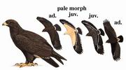 描述:体大(70厘米)的全深褐色雕雕。 尾短,蜡膜及脚黄色。体羽随年龄及不同亚种而有变化。幼鸟翼上及背部具明显的白色点斑及横纹。所有型的羽衣其尾上覆羽均具白色的"U"形斑,飞行时从上方可见。尾比金雕雕或白雕肩雕为短。