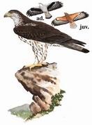 描述:体大(59厘米)的猛禽。翼尖深色,两翼及尾具细小横斑,剪影特征为两翼宽圆而略短,尾形长。成鸟尾部色浅并具黑色端带;翼下覆羽色深,具浅色的前缘;胸部色浅而具深色纵纹。成鸟飞行时上背具白色块斑。幼鸟翼具黑色后缘,沿大覆羽有深色横纹,其余覆羽色浅。上体大致褐色,头部皮黄色具深色纵纹,脸侧略暗。飞行时两翼平端。