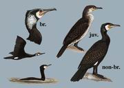 描述:体大(90厘米)的鸬鹚。有偏黑色闪光,嘴厚重,脸颊及喉白色。繁殖期颈及头饰以白色丝状羽,两胁具白色斑块。亚成鸟:深褐色,下体污白。