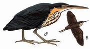 描述:中等体型(54厘米)的近黑色鳽。成年雄鸟:通体青灰色(野外看似黑色),颈侧黄色,喉具黑色及黄色纵纹。雌鸟:褐色较浓,下体白色较多。亚成鸟:顶冠黑色,背及两翼羽尖黄褐色或褐色鳞状纹。嘴长而形如匕首,使其有别于色彩相似的其他鳽。