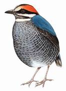 描述:中等体型(24厘米)的深蓝色八色鸫。头顶两侧橘黄色的宽带延伸至颈背,宽宽的过眼纹黑色,脸颊皮黄,髭纹黑,尾亮蓝色。雌鸟较雄鸟色暗,但下体的白色仍清楚可见。为中国唯一下体具横斑的八色鸫。