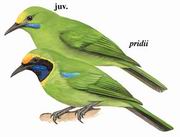 描述:中等体型(19厘米)的艳绿色叶鹎。额橘黄(雄鸟),翼具亮蓝色肩斑。雄雌两性的颏及喉均黑色。雌鸟略暗,亚种pridii黑色喉周围无金色带。亚成鸟无黑色颏及喉,但具绿色顶冠。