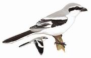 描述:体型甚大(31厘米)的灰色伯劳。眼罩黑色,眉纹白,两翼黑色并具粗的白色横纹。比灰伯劳体型大。三枚中央尾羽黑色,羽端具狭窄的白色,外侧尾羽白。亚种 giganteus比指名亚种色暗且缺少白色眉纹。