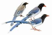 描述:体长(68厘米)且具长尾的亮丽蓝鹊。头黑而顶冠白。与黄嘴蓝鹊的区别在嘴猩红,脚红色。腹部及臀白色,尾楔形,外侧尾羽黑色而端白。