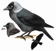 描述:体型略小(37厘米)的黑色及灰色鸦。嘴小且短。与家鸦区别在体型较小,嘴细小,虹膜蓝色。达乌里寒鸦幼鸟色深而少反差,虹膜色深,眼后具银色细纹。寒鸦幼鸟也具深色的眼及深灰色区域但耳羽无银色细纹。