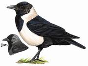 描述:体型略小(32厘米)的鹊色鸦。白色斑纹延至胸下。与白颈鸦的区别在体型较小且嘴细,胸部白色部分较大。幼鸟色彩反差小,但与寒鸦成体的区别在眼深色,与寒鸦幼体的区别在耳羽具银色细纹。
