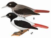 描述:中等体型(28厘米)的黑色及银白色鹂。尾洋红色,雄鸟甚有特色。雌鸟似朱鹂雌鸟,但黑色的头与灰色的背成对比,下体较白且纵纹较窄。