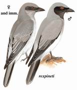 描述:体大(28厘米)身灰的伯劳样鸟。脸及颏黑色。雄鸟:上体及胸灰色,飞羽黑色具近白色羽缘,尾黑,尾中线深灰,尾端棕灰,腹部偏白,眼先及眼圈黑色,喉深灰。雌鸟色较浅,下胸及两胁具灰色横斑。亚成鸟似雌鸟,但多偏褐色,下体及腰部横斑粗重。