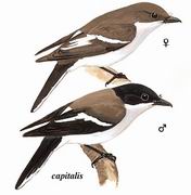 描述:体小(15厘米)的鹊色鹟鵙,具宽的白色翼斑。与灰山椒鸟的区别在体型较小,腰偏白。与小斑姬鹟的区别在无白色眉纹。