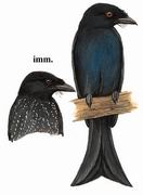 描述:中等体型(29厘米)的黑色卷尾。嘴厚重似乌鸦,尾叉形,外侧尾羽上翻。与黑卷尾的区别在嘴较厚较宽,尾开叉不如其深,体羽具绿色光泽而非蓝色光泽。亚成鸟下体下部具偏白色横纹。