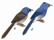 描述:中等体型(16厘米)的灰蓝色鹟。雄鸟:头、胸、背及尾蓝色,翼上多灰色,腹部近白,羽冠短,嘴上的小块斑及狭窄的喉带黑色。雌鸟:头蓝灰,胸灰色较浓,背、翼及尾褐灰,少雄鸟的黑色羽冠及喉带。