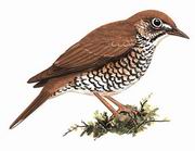 描述:体型略大(26厘米)的地鸫。上体全红褐色,外侧尾羽端白,浅色眼圈明显,翼部白色斑块在飞行时明显,但停歇时不显露。与长尾地鸫的区别在尾较短,胸具鳞状斑纹而非黑色横纹,翼上横纹较窄而色暗。