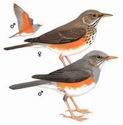 描述:体型略小(24厘米)的灰色鸫。两胁棕色。雄鸟:上体全灰,喉灰或偏白,胸灰,腹中心及尾下覆羽白,两胁及翼下橘黄。雌鸟:上体褐色较重,喉及胸白,胸侧及两胁具黑色点斑。与雌乌灰鸫的区别在上体灰色较重,嘴黄;与雌黑胸鸫的区别在胸较白。