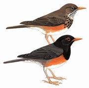 描述:体型略小(23厘米)而结实的深色鸫。雄鸟:整个头、上背及胸黑色,背深灰,翼及尾黑,下胸及两胁为特征性鲜亮栗色,腹中央及臀白。雌鸟上体深橄榄色,颏白,喉具黑及白色细纹,胸橄榄灰并具黑色点斑。胸部灰色而有别于雌灰背鸫。臀白,翼近黑,尾深橄榄色。