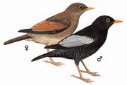 描述:体型略大(28厘米)的鸫。雄鸟:似乌鸫,但宽阔的灰色翼纹与其余体羽成对比。腹部黑色具灰色鳞状纹,嘴比乌鸫的橘黄色多,眼圈黄色。雌鸟全橄榄褐色,翼上具浅红褐色斑。